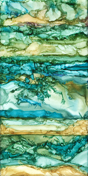 "The alcohol inks that I use for my art demand room and will not tolerate much control, which can be challenging, but is always invigorating. As I layer colors, senses of places both familiar and new emerge into pathways that turn into landscapes. A run-away drop becomes a rooftop. I slide the side of my brush and a stone fence appears. A repeated stroke might evoke a stand of trees or a field of hay. I become lost in worlds within worlds as the painting changes, until the colors tell me it is time to stop and the finished piece holds within it a place for the viewer to go.”
