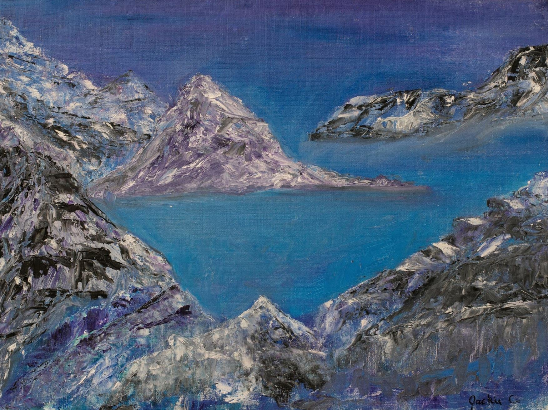 Jackie often creates nature scenes from memory about calming places where she has felt happy or safe. She hopes that others too can experience peacefulness by viewing her art. She says, “I want to make someone happy with my paintings or feel relaxed. It is my hope that if my art is hanging in someone’s home, that it can help them feel calm or reconnected to nature after a stressful day.”