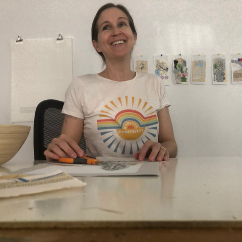 Kate’s work is very process-driven, so the making of it is as important as the final product. The way she works is both methodical and meditative - whether it's printmaking, collage, or pointillism. She details, “These are, in many ways, labors of love. Slow meditative work where the materials and process are very much collaborators and the pieces unfold organically.” Her process of making new work varies, depending on the medium and scale. For printmaking, she often starts with a sketch. For pointillism pieces, she starts with the size of the panel and uses that to help guide how she utilizes the space. She likes restrictions and rules to help give her boundaries which prompt ideas how the piece should be formed.