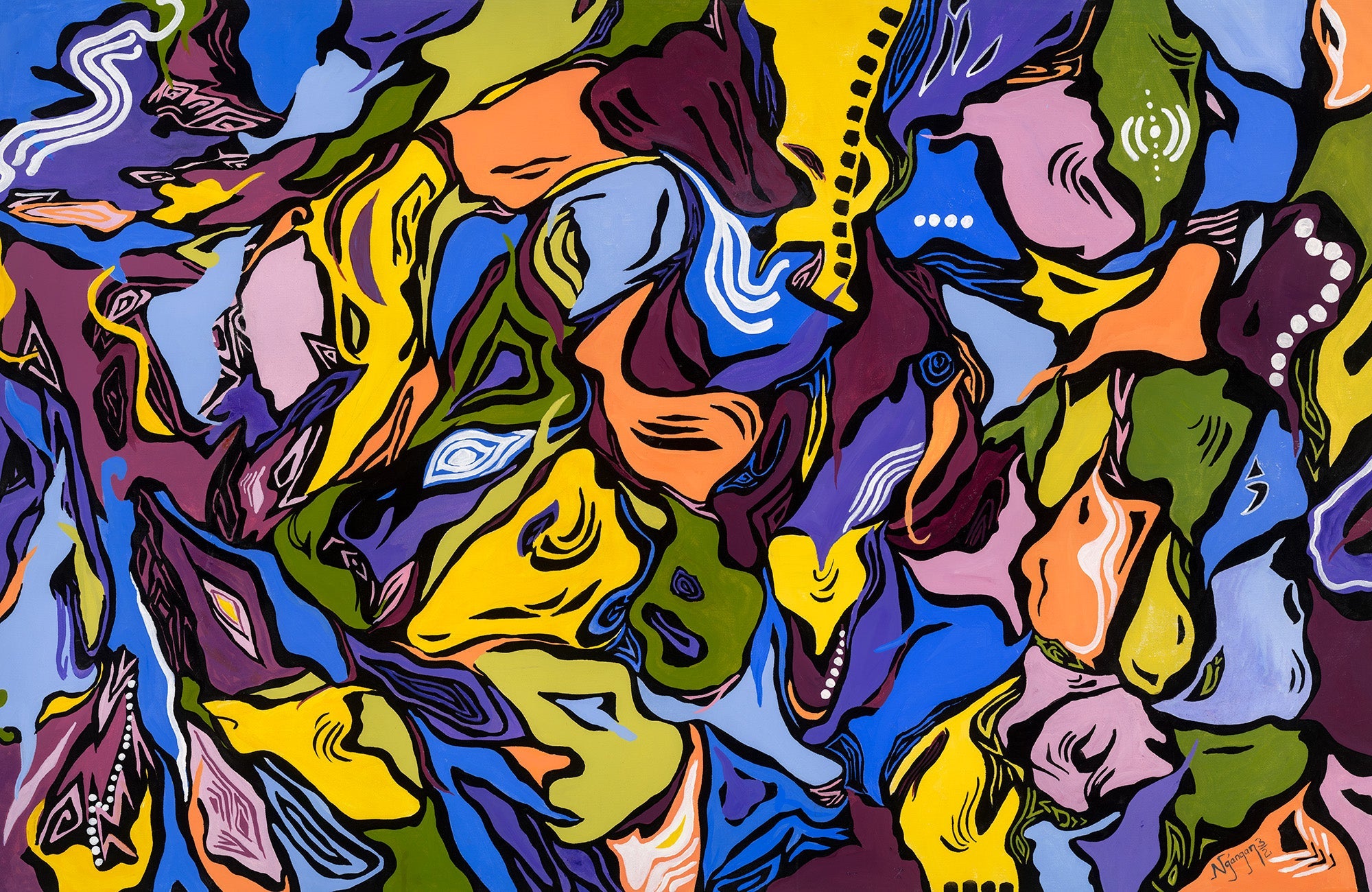 Kennedy’s art reflects both the challenges and triumphs of his life. His paintings often capture elements of his coastal environment- the light, the colors, the rhythms of daily life in Mombasa, infused with emotion and symbolism that speak to universal human experiences. He draws inspiration from dreams, personal reflection, and the works of other artists, blending these influences into pieces that are both deeply personal and widely relatable.