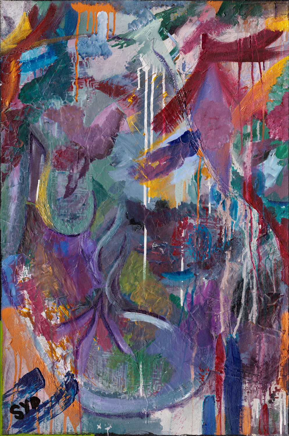 Sydnee Yates (she/her/hers), an artist with a Literary degree from college woke up one day, looked in the mirror, and saw fragments of her identity shattered around her, causing her to pursue treatment for mental health.  Her journey navigating her diagnoses of Bipolar disorder, PTSD, and an eating disorder have been the largest influence for her art. While in treatment, Sydnee picked up painting after many years of suffering from an artistic block. Painting, she says, “gifts me the space to move trauma through my body onto the canvas; it’s the physical place where I can safely process whatever it is I’m working through.”