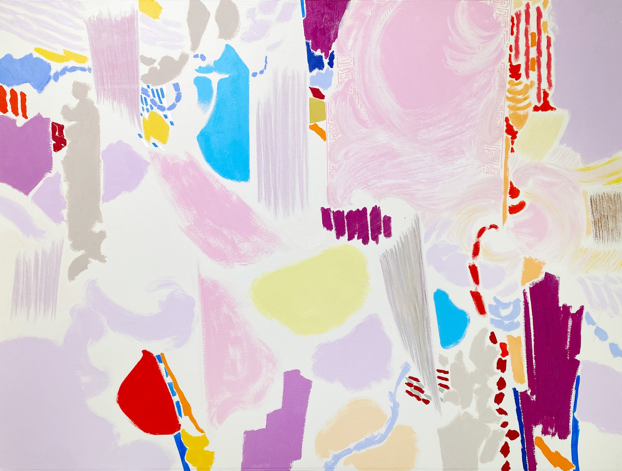 "Abstract, nebulous, soft, forms invite the viewer into imaginary landscapes in this colorful series. The perspectival depth changes as some shapes resonate vertically, and suggestions of patterns and architectural motifs shift the viewer's scale orientation. The variation of shimmery and matte surfaces furthers the play of light as an orienting factor. The world, these paintings suggest, no matter how solid-seeming, takes on a spiritual, playfully alive and metaphysical dimension that is always shape-shifting, moving, rhythmic, fun, and dynamic."