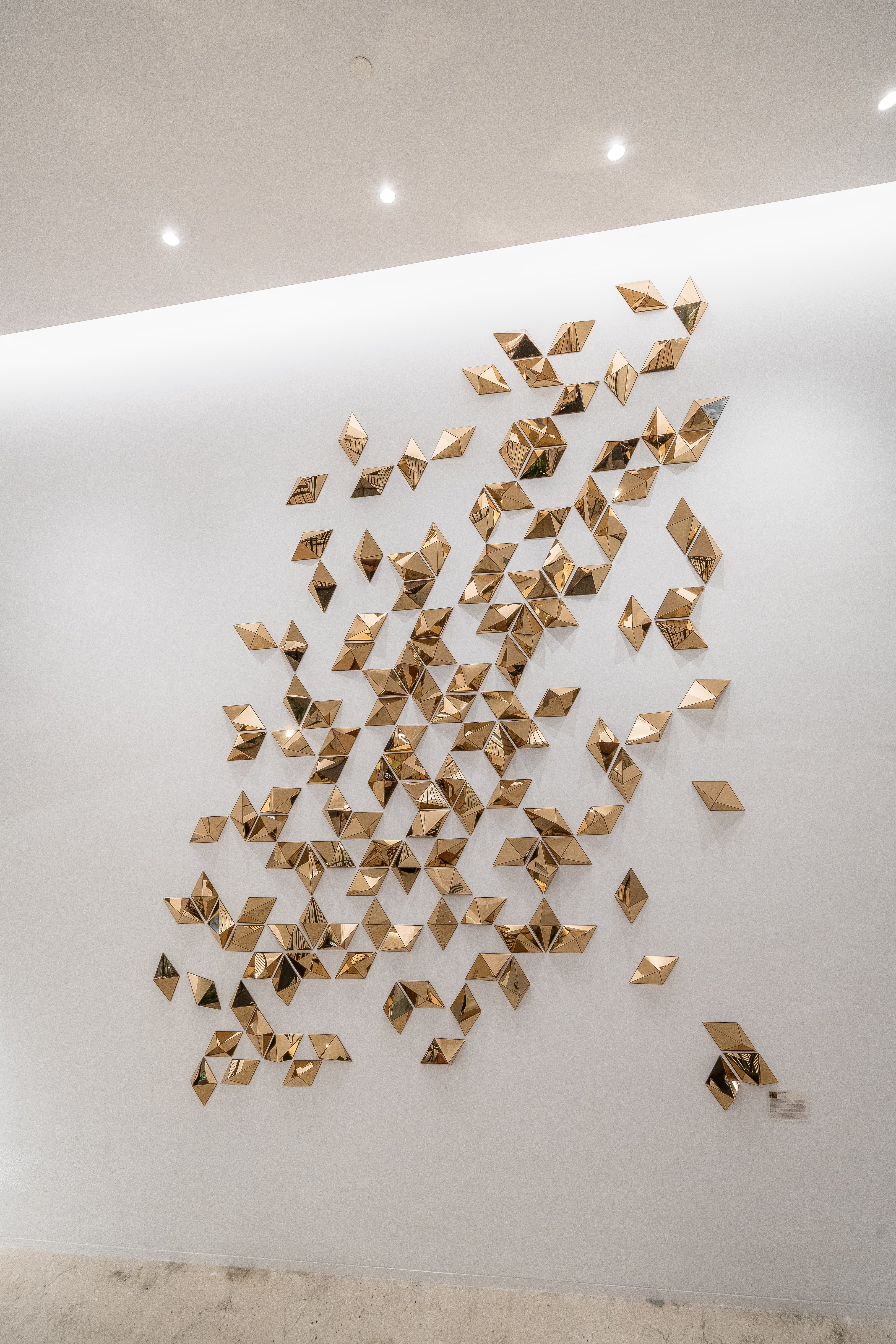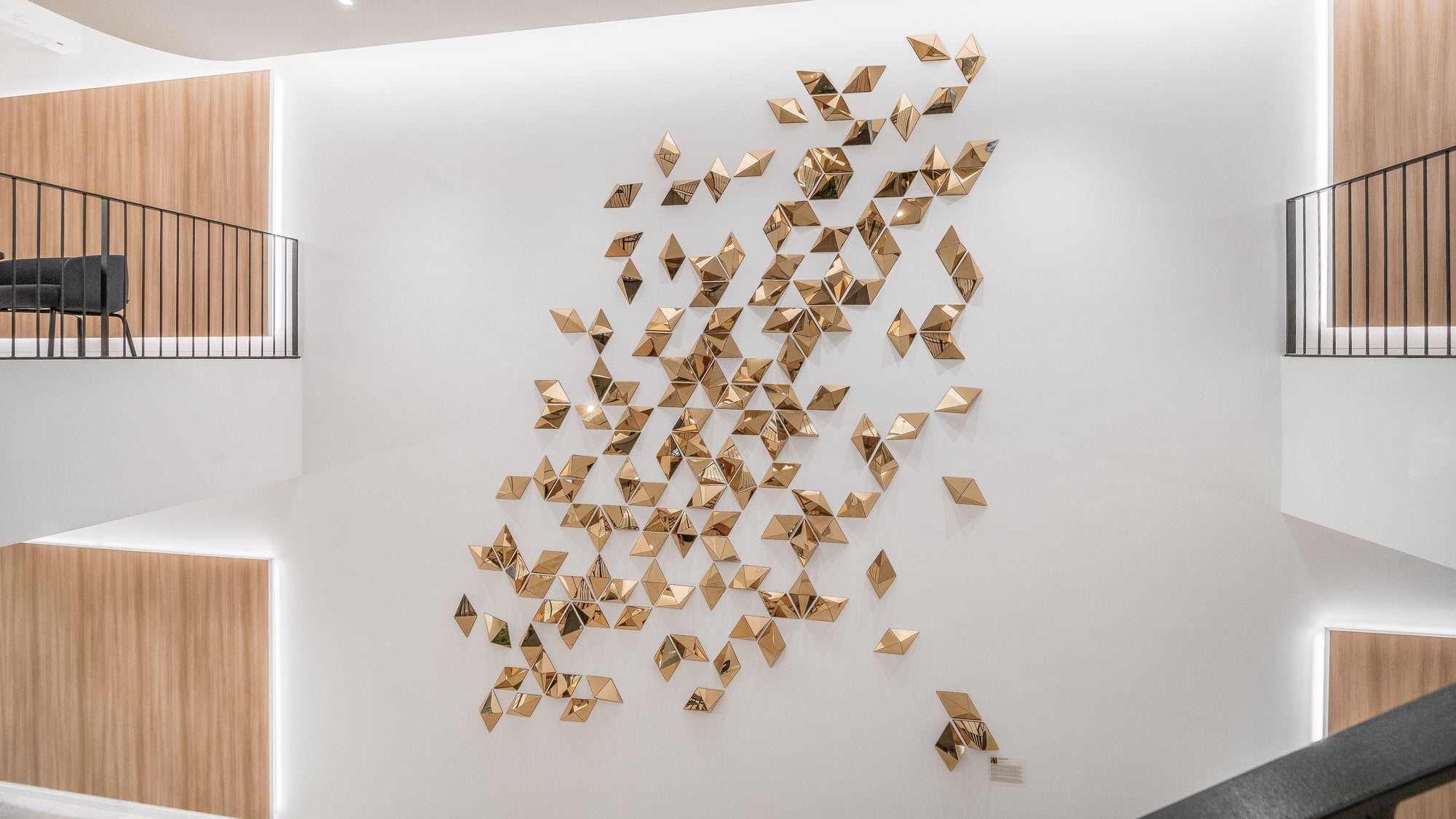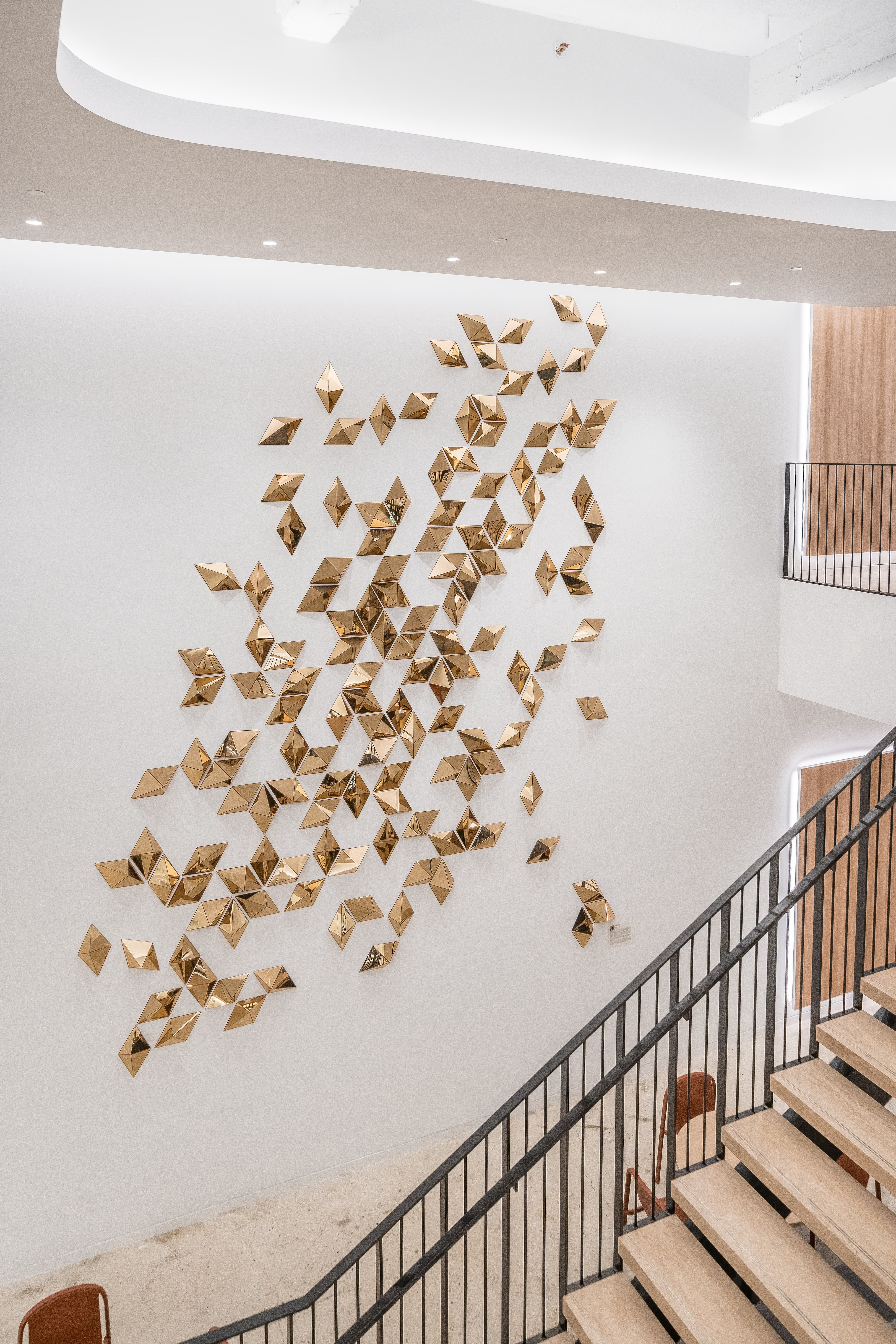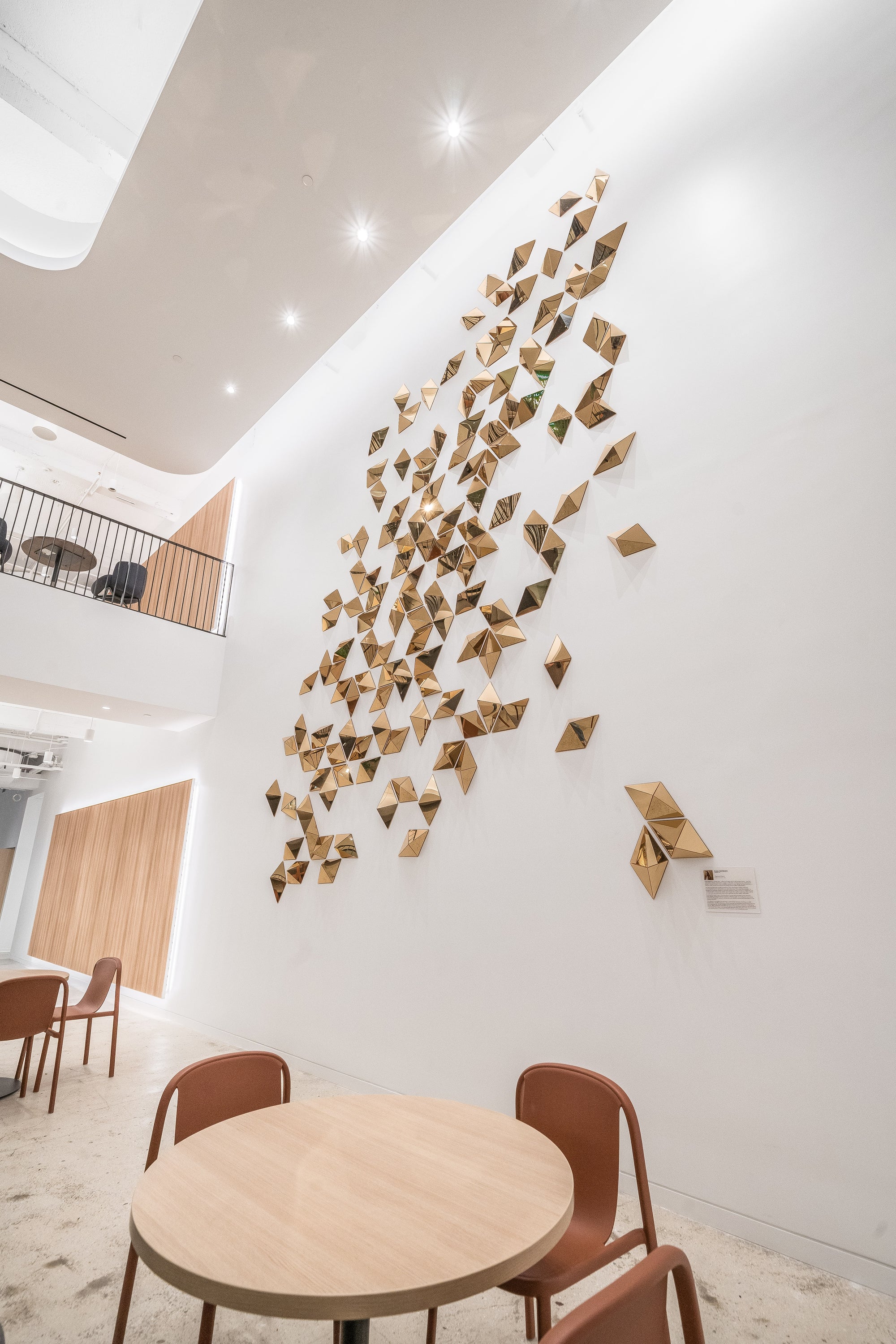 1. Banner: Eliza Redmann’s sculptural wall installation, Diamond Dream, graces the lobby of JRM with its striking presence. Comprising 140 golden triangular pieces, the artwork cascades gracefully from near the ceiling to the base of a pristine white wall. Illuminated by overhead light fixtures, the installation radiates a captivating brilliance, creating a dynamic contrast against the lobby’s minimalist aesthetic. At the same time, its refined design harmonizes beautifully with the space's polished finishes.