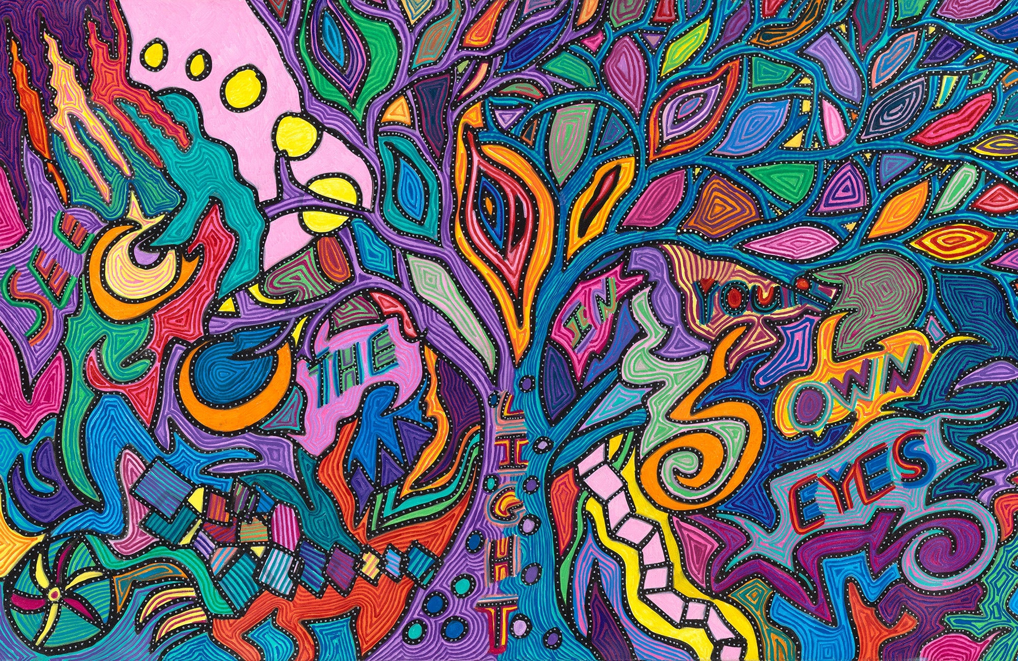 "Bold lines, shapes and colors with poetic message. This painting represents the tree life. Specifically the tree of life that is in the middle of the Sun Dance arbor at the sacred Lakota Sundance. The colors represent the prayer ties that are wrapped around the Sun Dance tree that is there all year long. At the end of the year that tree comes down and gets put into the sacred fire that is used at the sweat lodges at the dance for that year. Then, a new tree gets put in its place and the cycle continues. The painting is also about prayer. The Sun Dance is one big prayer. For me, it was a prayer about healing myself and learning to love myself and eventually "seeing the light in my own eyes." So the painting, with the message written in it, is also an encouragement to others to love themselves and literally "see the light in their own eyes.""