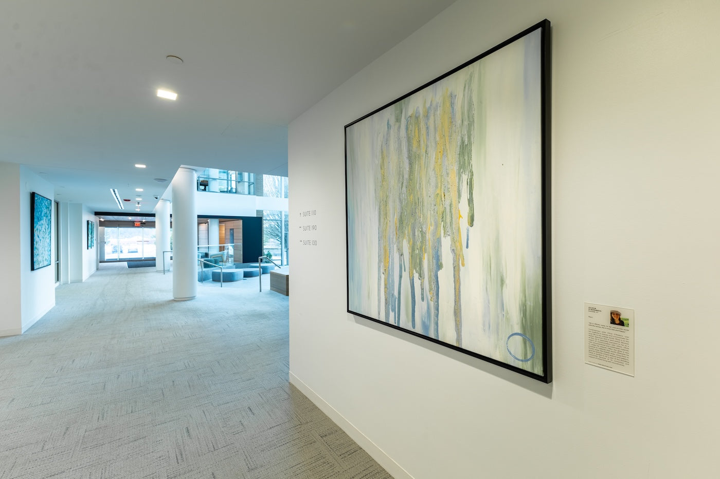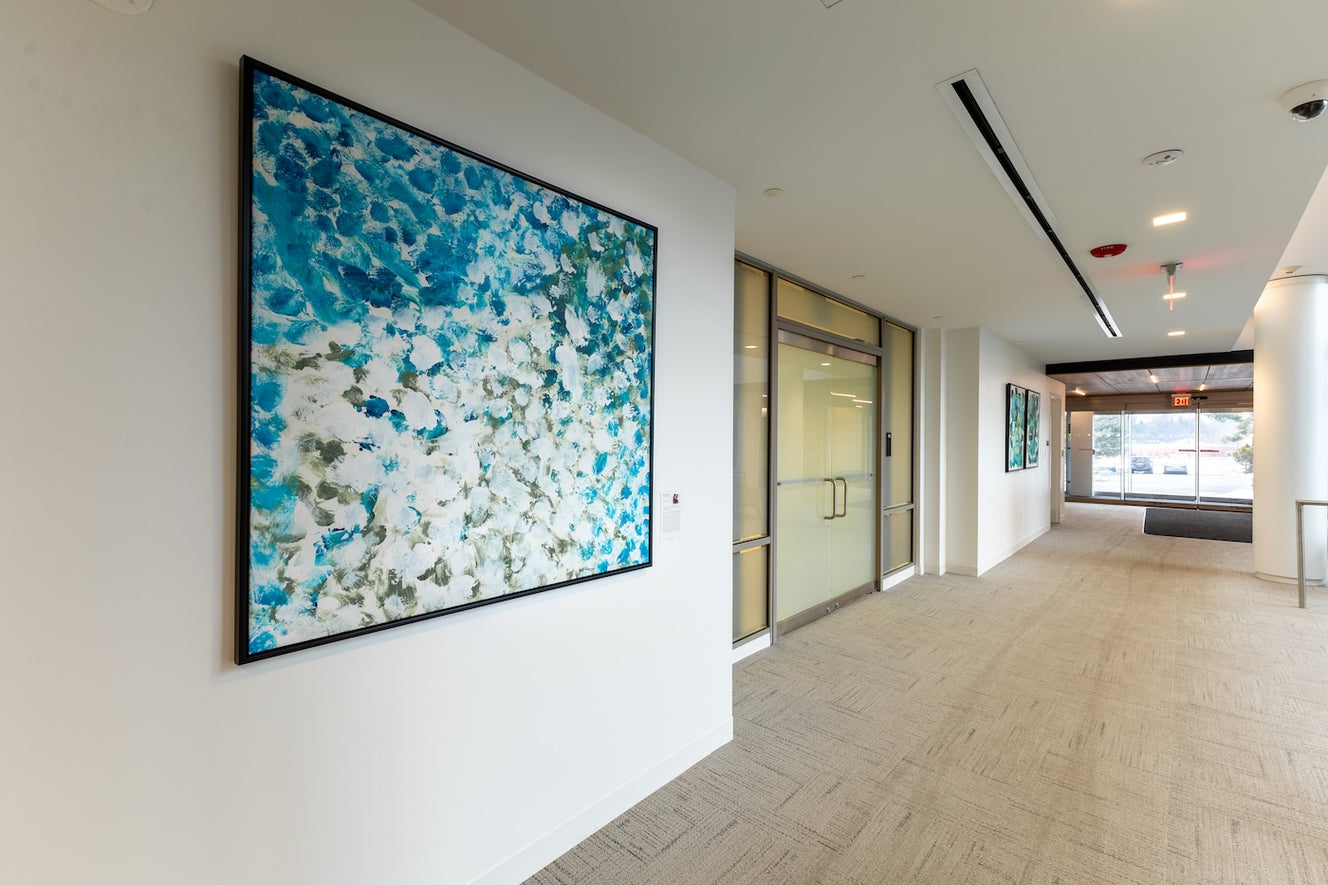 7. Two abstract paintings by Olivia D’Addario, Happy Ocean and Calm Sunset, featuring layered brushstrokes in teal, green, and hints of blue and yellow, creating an energetic yet balanced feel in a bright atrium hallway.