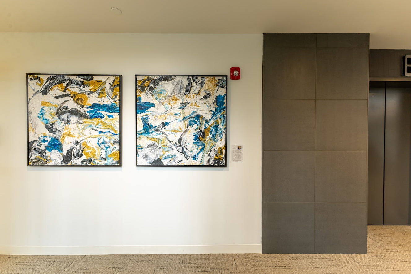 6. Two abstract paintings by Billy Megargel, A1384 and A1385, featuring swirling layers of gold, blue, black, and white with a marbled texture, evoking movement and energy against a minimalist hallway backdrop.