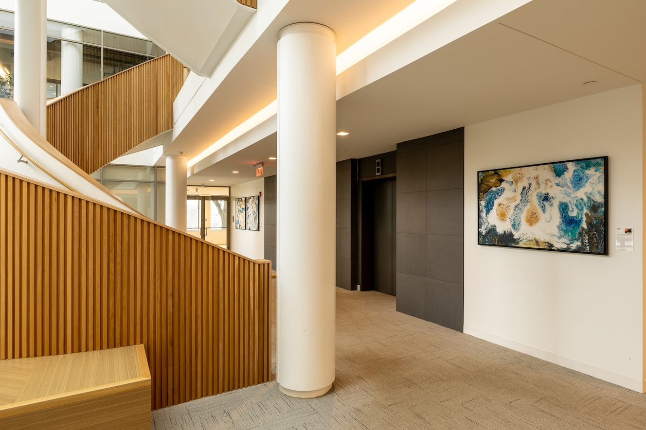 9. Tous les bleus by Damiano Austin hangs near a sleek elevator in a bright lobby with white walls, beige flooring, and warm wooden staircase panels.