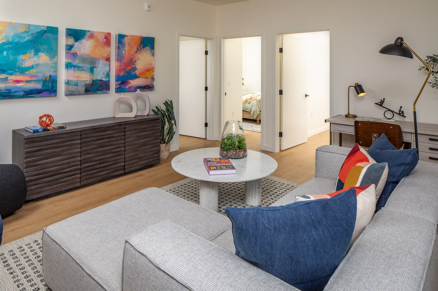 Three prints by Denali Brooke hang above a dark brown counter in the living room of a show unit. The artwork’s blue, orange, and pink tones echo the accents on the nearby decorative objects and the pillows on the gray couch, creating a harmonious and inviting atmosphere. Photo courtesy of Think Joule.