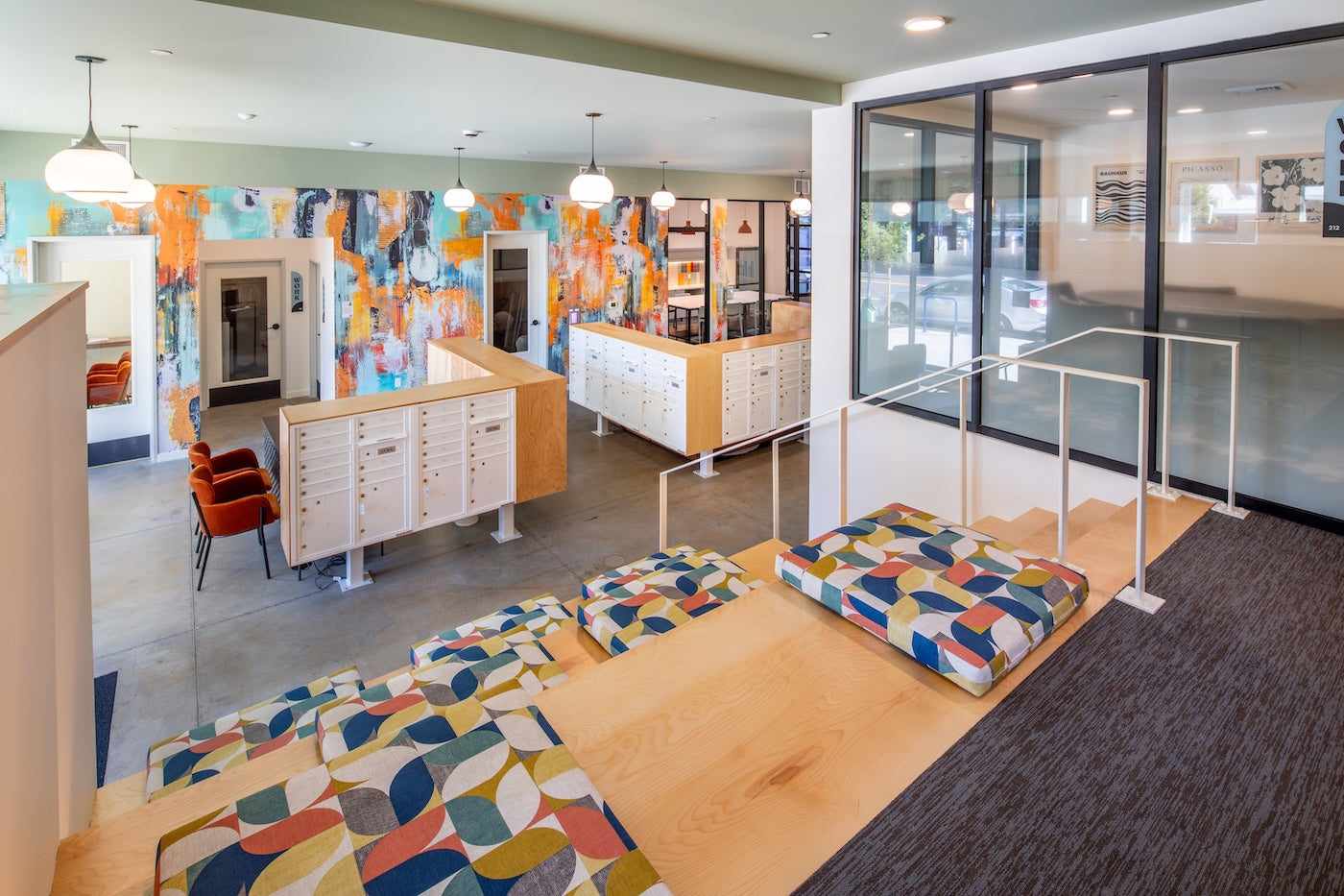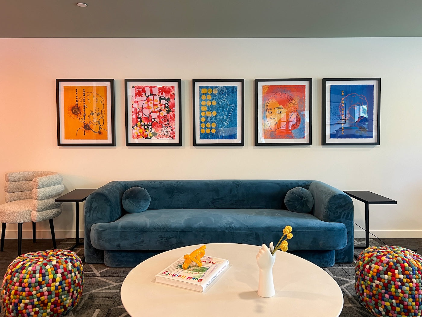 2. Five colorful prints by Lisa Murphy hang side by side in the coworking lounge. The vivid yellows, reds, and blues in the artwork complement the plush blue suede couch below and the multicolored ottomans on either side, creating a lively and dynamic setting. Photo courtesy of Think Joule.
