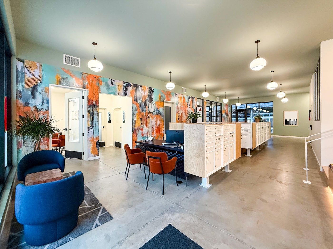3. Yvette’s wallcovering, Leave the Lights On, Communities Will Recover, brings vivid color and powerful symbolism to the coworking space near the lobby. Photo courtesy of Think Joule.