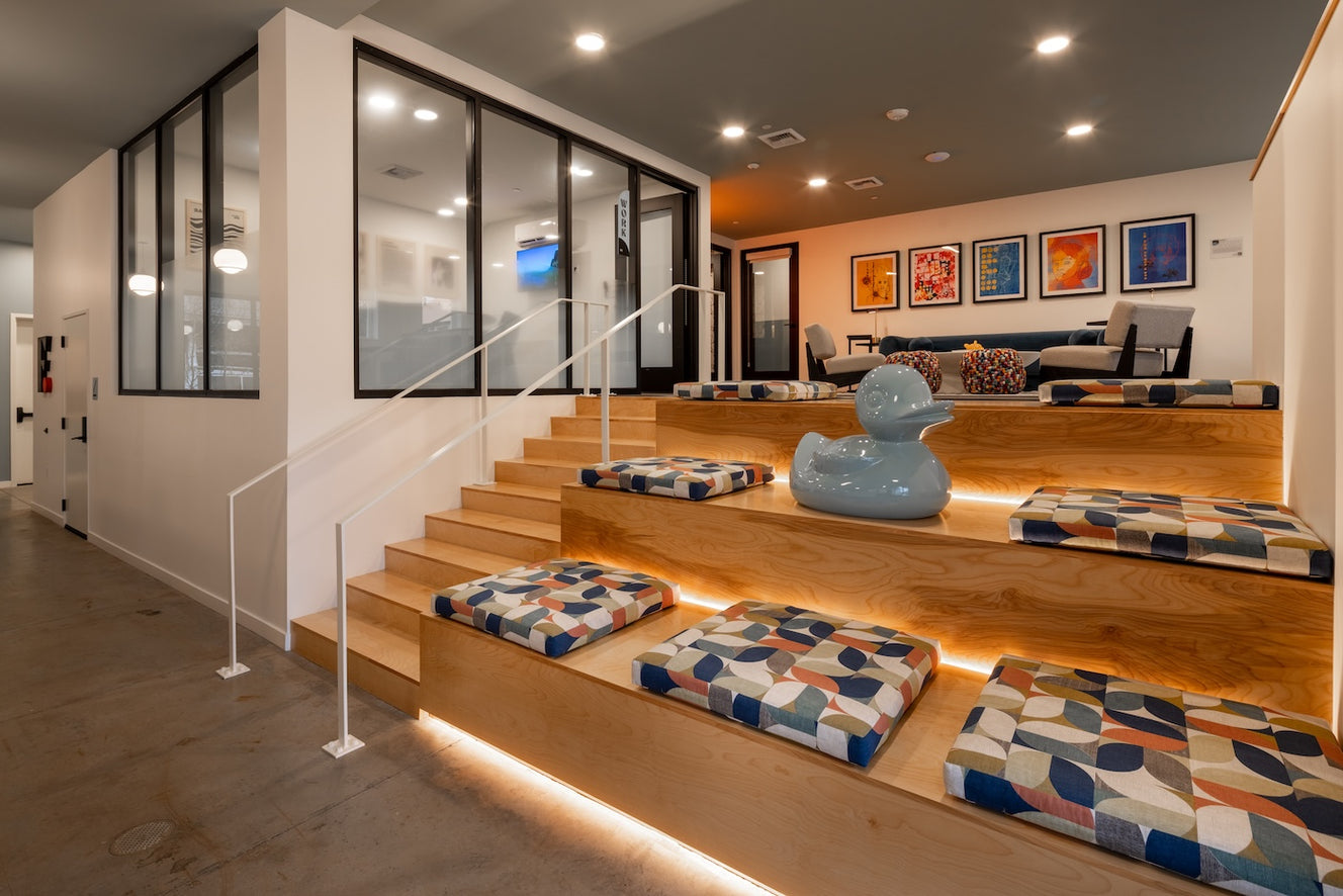 4. The mezzanine of the coworking space features built-in wooden seating with colorful cushions and a large gray sculpture resembling a rubber duck at its center. To the left, a wooden staircase leads to the lounge area where Lisa Murphy’s five prints are installed. Photo courtesy of Think Joule.
