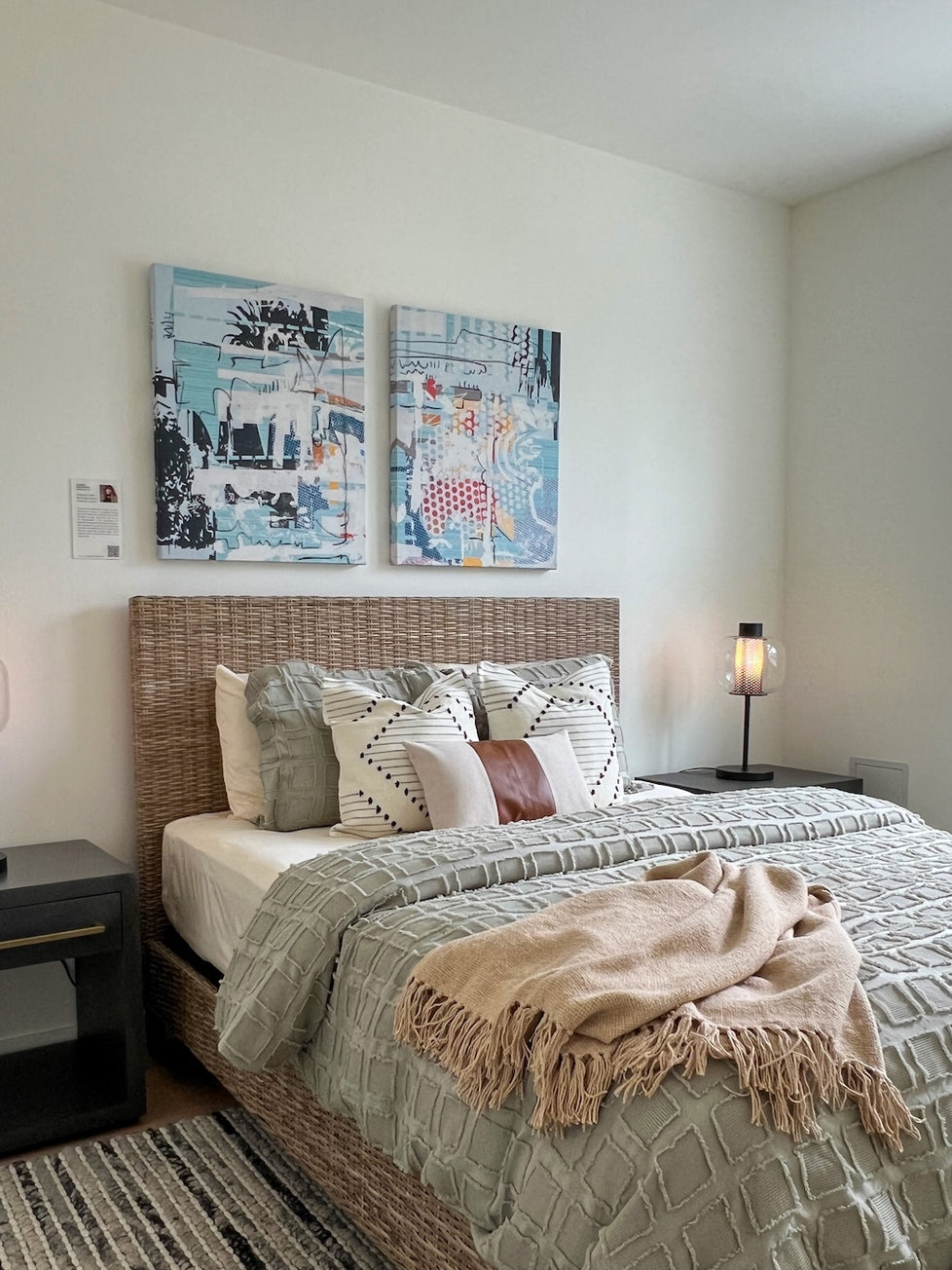 6. Two prints by Laural Hartman hang above the bed in a show unit’s bedroom, adding a refined artistic touch to the softly styled sleeping space. Photo courtesy of Think Joule.