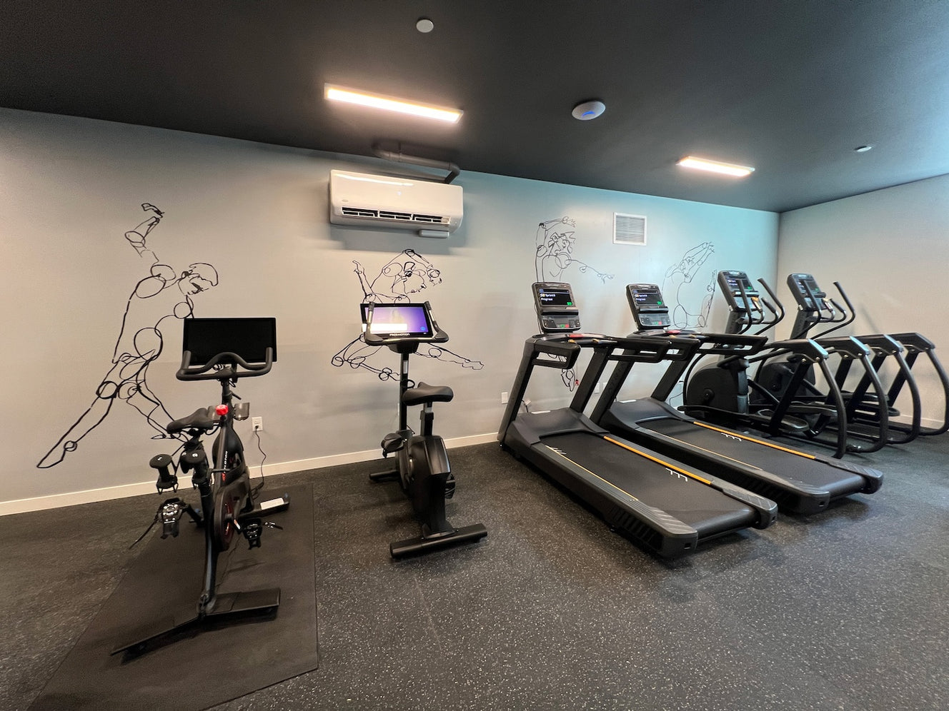 5. Vinyl cutouts of Lindsey Holcomb’s artwork animate the walls of The Frankie’s fitness center. The silhouettes — depicting people in joyful, dynamic poses — appear to leap and dance in front of the cardio machines. Photo courtesy of Think Joule.