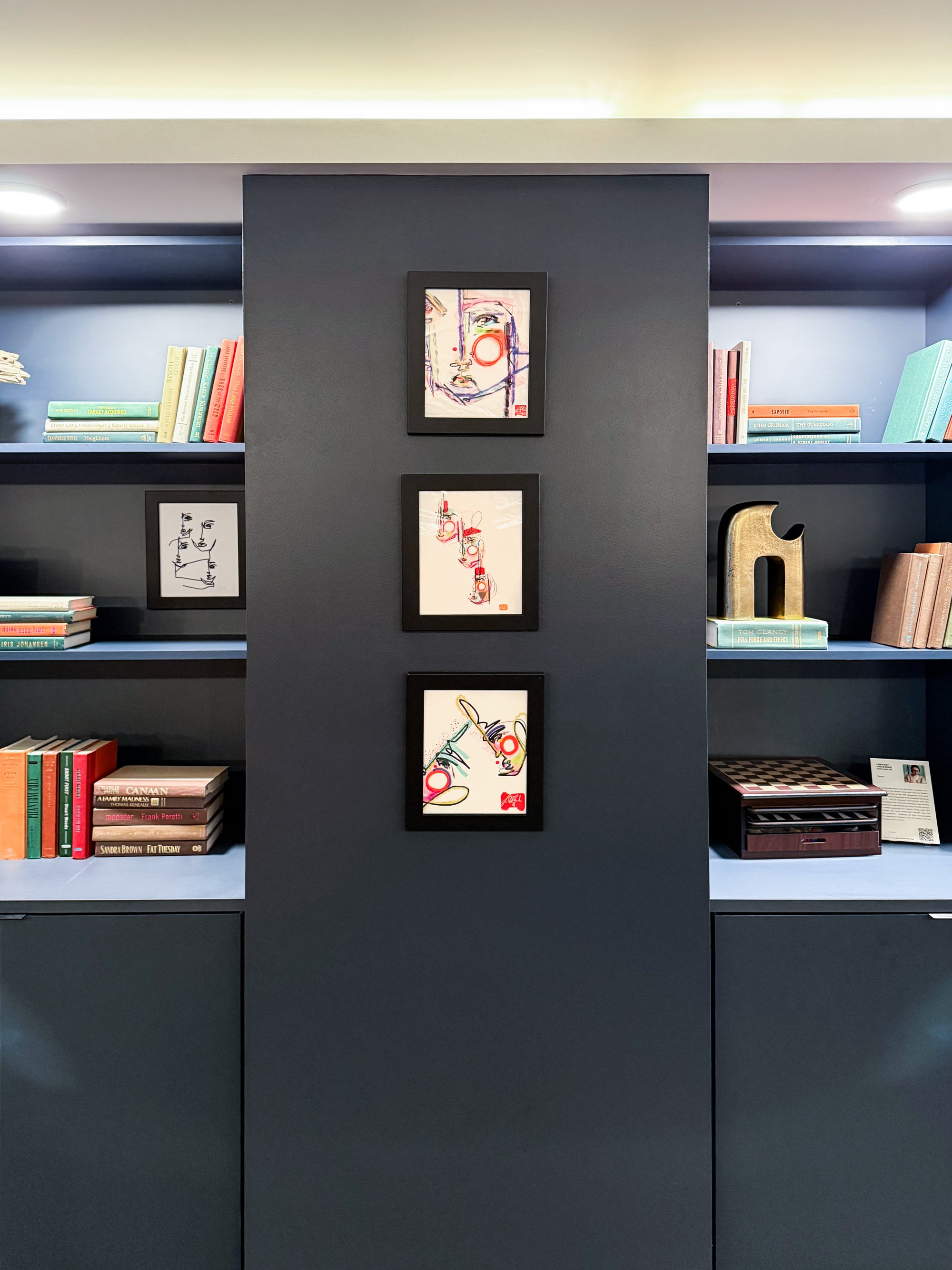 7. Four small-scale prints by Lindsey Holcomb are arranged on a gray wall between two bookshelves. The artwork adds bright pops of color and complements the eclectic mix of objects and books surrounding it. Photo courtesy of Think Joule.