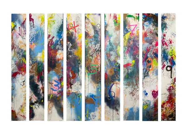 "1-9, the inspiration was the canvas it self. when I see canvas that I have never had the pleasure of work on it excite me, it is a free for all. I am a self-taught abstract artist, I let the colors speak to me, never intentional, its a vibe that my soul reach for."