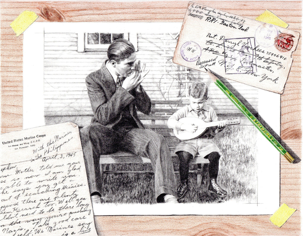 "All Quiet, is dedicated to Darryl Voorhees (b. April 25, 1926 - d. April 18,1945) and to all those who have bravely given their lives in active militaryservice. Depicted is my grandfather, Kenneth M. Vaughn with his nephew, DarrylVoorhees. The reference photo was taken around 1930. The letter in theforeground, postmarked April 10, 1945, is from my grandfather, who was serving inthe U.S. Marines during WWII. It is addressed to his nephew, Darryl, who wasalso serving in WWII with the U.S. Marines in Europe. The letter was returnedunopened. On April 18, 1945, Darryl Voorhees was killed in action, just one weekprior to his 19th birthday."