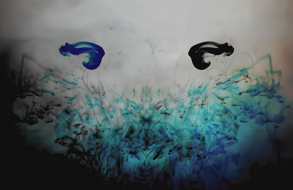Mirror-image negatives, Sunset, emerald and blue in deep shadow. Delicate tendrils of liquid create a Rorshach test for the viewer."