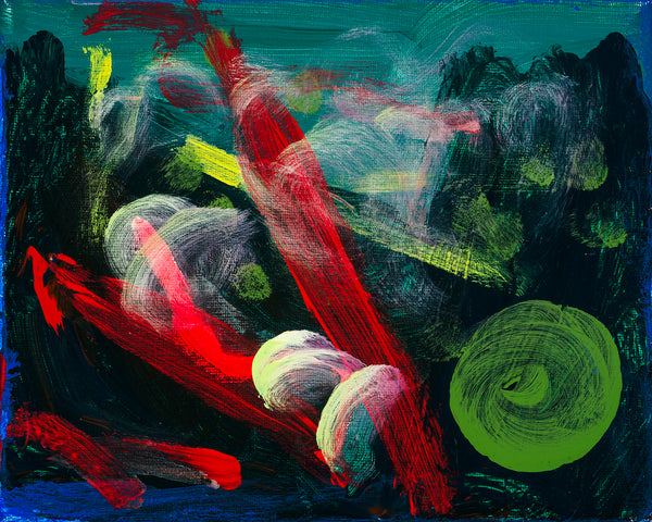 "Beyond the Earth is an original abstract painting that reminds me of a dream. You are not awake and yet images go through your mind. The image doesn't belong anywhere on earth, yet I can't call it outer space. It belongs somewhere in the universe of my imagination. This painting is darker than most of my images, but I had to figure out something to do with my dark green paint. These shades of green required contrast to come to life and make me feel energy. I created a temporary escape for myself in this painting. Maybe you can can look at it and find your own escape."