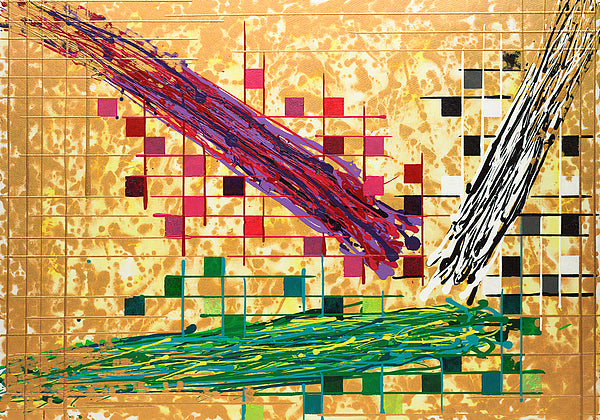 "This is purely an abstract piece. I combined several styles in this piece. I used a mottled gold effect for the back ground, colorful streams liquid paint and a geometric pattern overlaid on part of the surface. This was a piece that took a bit more time but one I especially enjoyed creating."