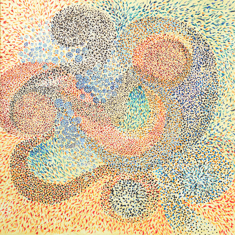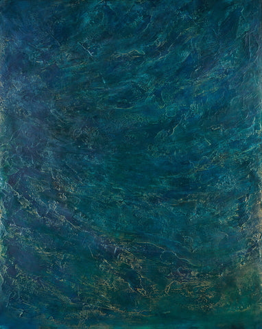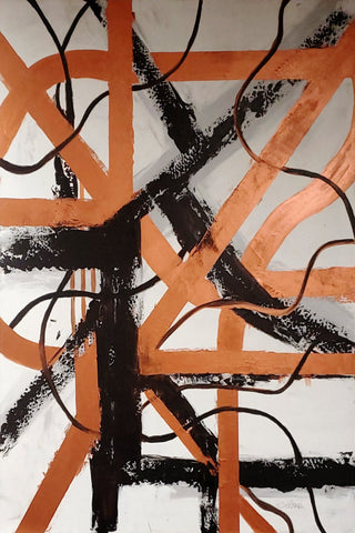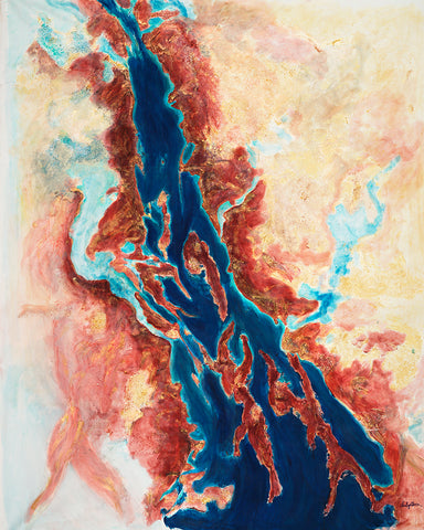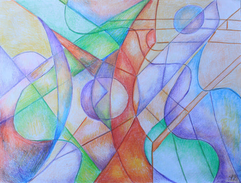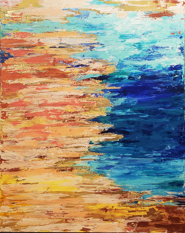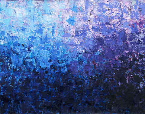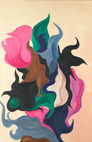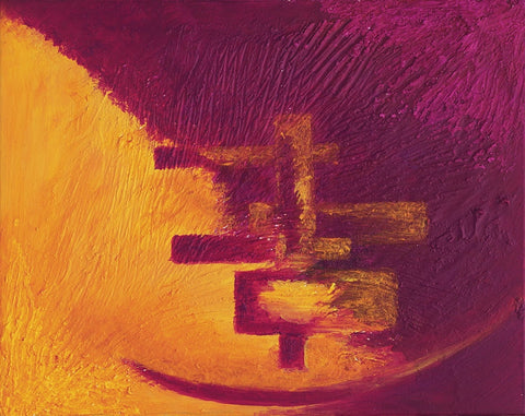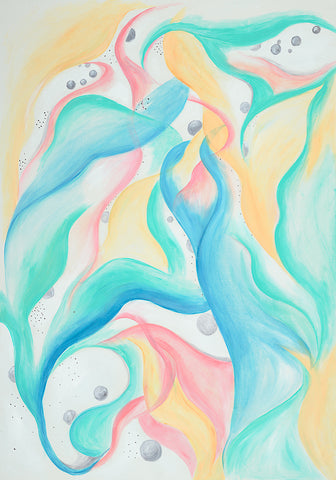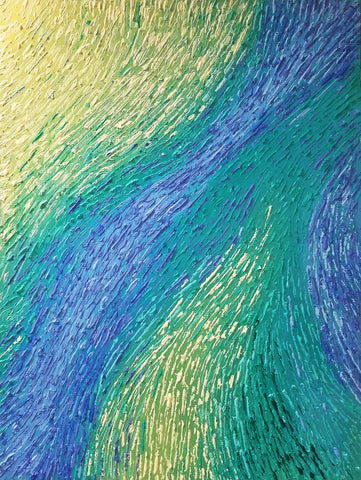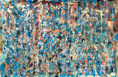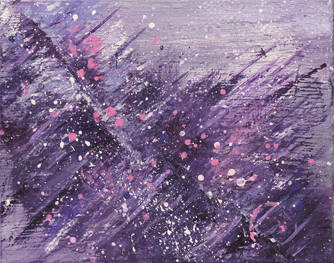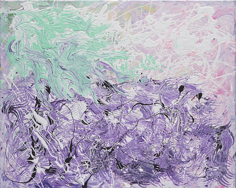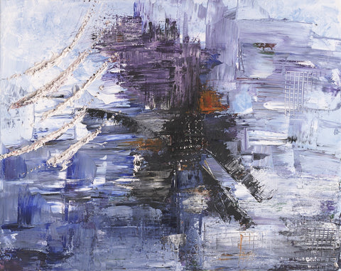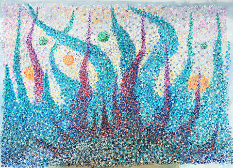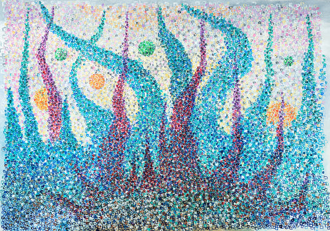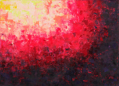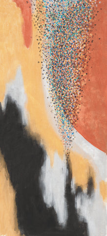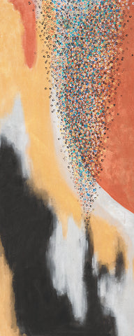 "That painting is in 3 stages. First, in 2016 I was enjoying mixing yellow, orange, and red, and it looked like a fire. I saw a movie how glass figures were made and it was very impressive how in fire the glass becomes unrecognizable beautiful. This is how the flower like creation was born, it seems like made out of glass. To combine both I had to sprinkle colors and colors which is the human guidance and effort."