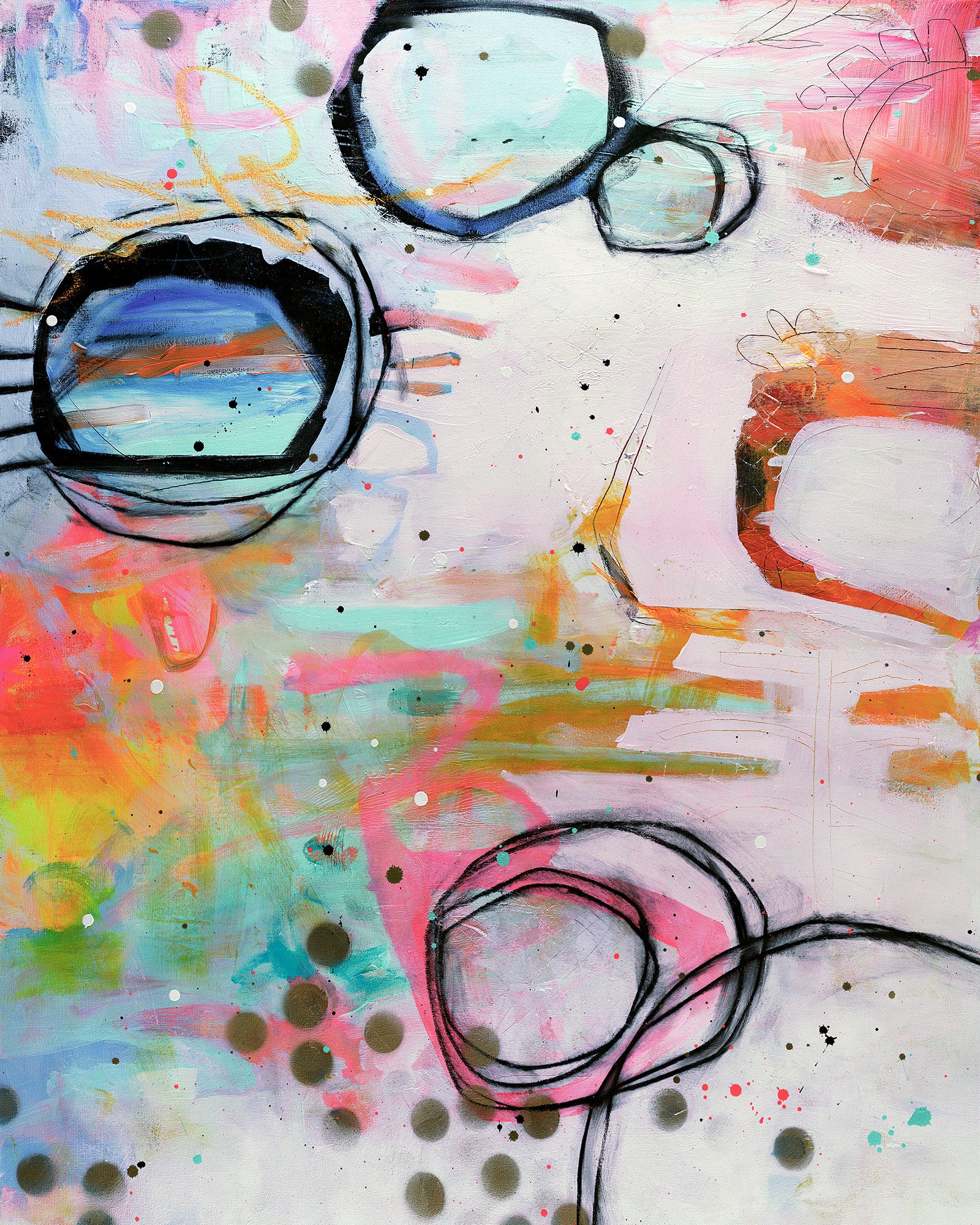 "I love to play and do the work of discovery when it comes to art. This piece was created in tandem with "I Got A Degree." I find that pieces like these that surface when I let myself approach the canvas with passion and joy and complete freedom, show off those feelings! I began with lines and shapes drawn with pigment sticks, and continued with loose, big strokes of acrylic paint, spray paint, oil sticks, pattern, and mark-making with acrylic markers and watercolor pencils. Vivid fluorescent color, comforting soft shapes, and a feeling of movement give these pieces an overall sense of brightness and fun."