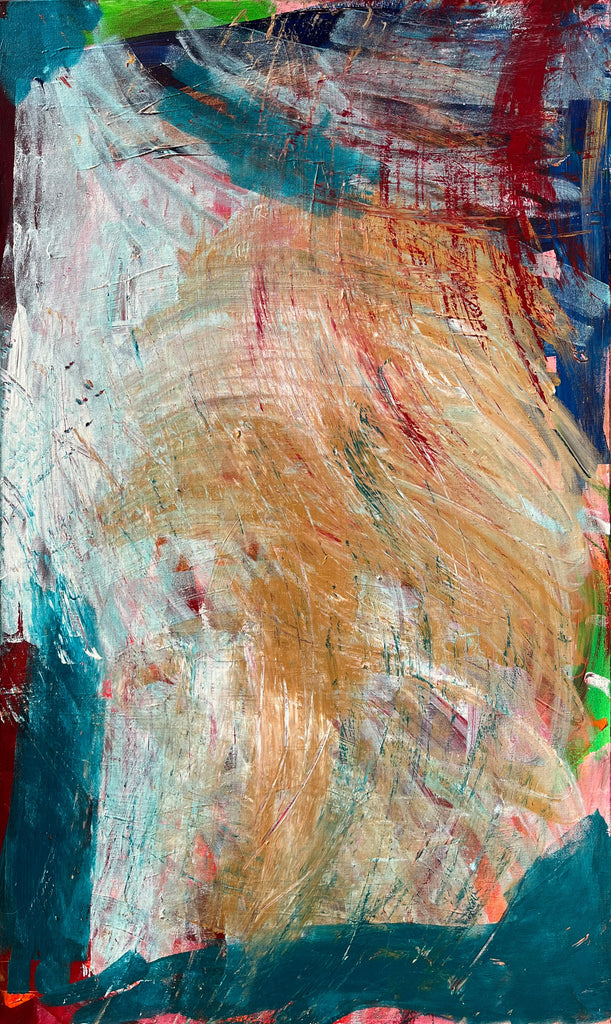 "Knockout has an interesting history. The original Knockout was painted in 2020 during the pandemic and exhibited at Golden Belt Gallery in Durham, NC. It was flamboyant. I decided in 2022 that it was too loud. I used many different colored layers over the original painting to tone down the original."
