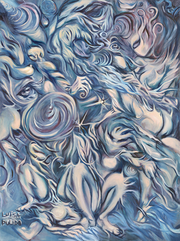 "I made this painting when I was on a cloud nine for a couple of years, and I was painting a bunch of large oil paintings. I was trying out different techniques and there were a lot of radical changes going on in my life which is being reflected by all the movement in this painting. Growing up I spent a lot of time by myself or a couple of friends, but things began to change for me when I began learning about the internet. I got on social media and began to have big impressions from the people I was communicating with. So many things were changing all the time, and at times it felt like life was moving too fast for me.
