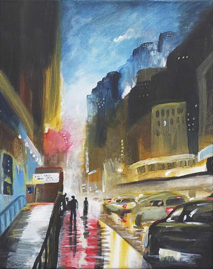 "I wanted to evoke a foggy, cold night in the city that never sleeps. I gave it a "watercolor-esque" feel and foggy, mystical quality. I love painting cities, but do not think I could live downtown."