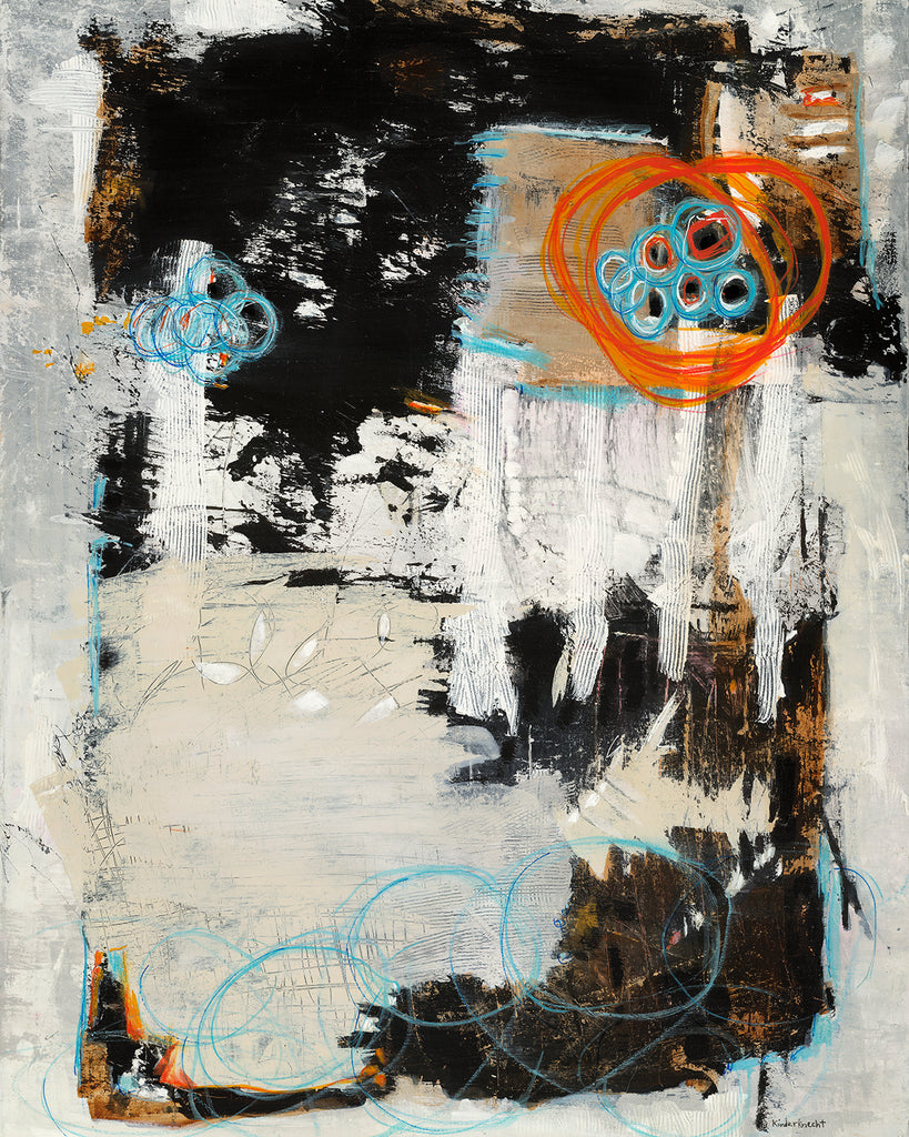"The colored circles in "Sentience" represent living beings that exist and stand out from the background. I wanted to show how the dichotomy of both cool (blue) and warm (orange) can co-exist harmoniously on the same background."
