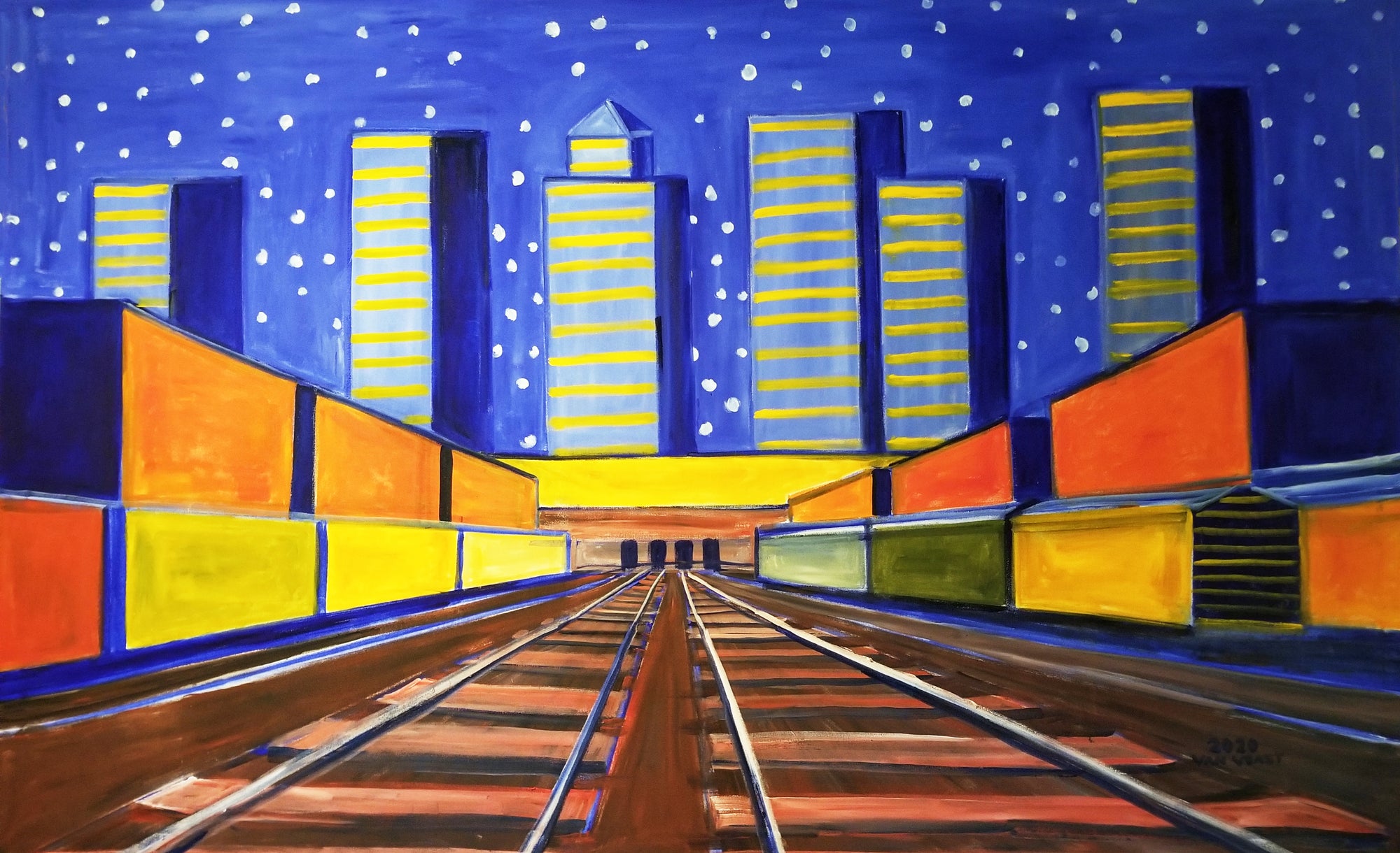 "This is from my imagination. I had observed in the South Seattle area, a corridor of warehouses on each side with railroad tracks in between and stationary box cars also on each side, and then tall buildings with lights."