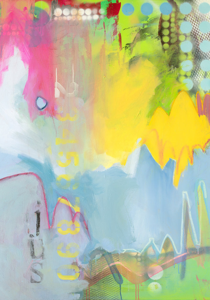 "This particular piece was created on a canvas salvaged from a local Goodwill. Utilizing Stencils, Abstracted shapes, and numbers I used Oil pastel and Neon spray paint to create Illustrations of landscapes. You are able to see a series of numbers between one through nine. I instinctively wanted you to say the number ten without seeing the number 10. Growing up I have been in different forms of therapy to help with speech, hearing, and my ADHD. Counting to ten was one of the many methods used to release anger."
