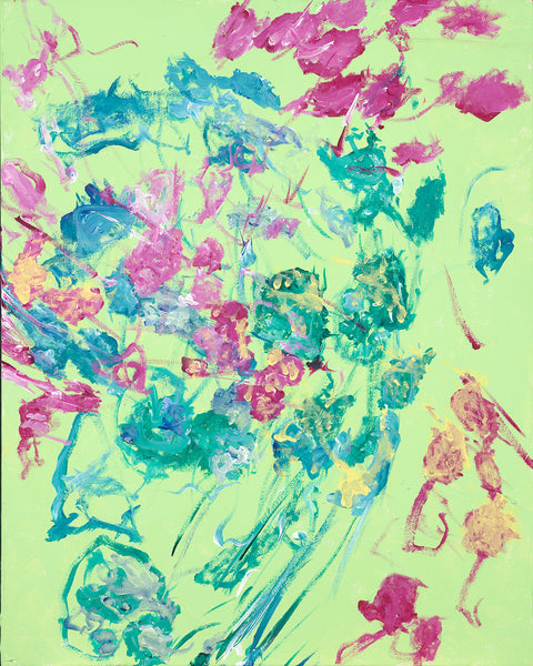 "Mia is still totally embracing the feeling of relief with reopening/returning to "normal" after the pandemic. Mint green background makes the pinks and reds pop joyfully. The strokes are bold and powerful. Mia feels strong and ready to welcome the positive possibilities 2021 can bring. At the same Mia shows her sense of humor with the overall composition."
