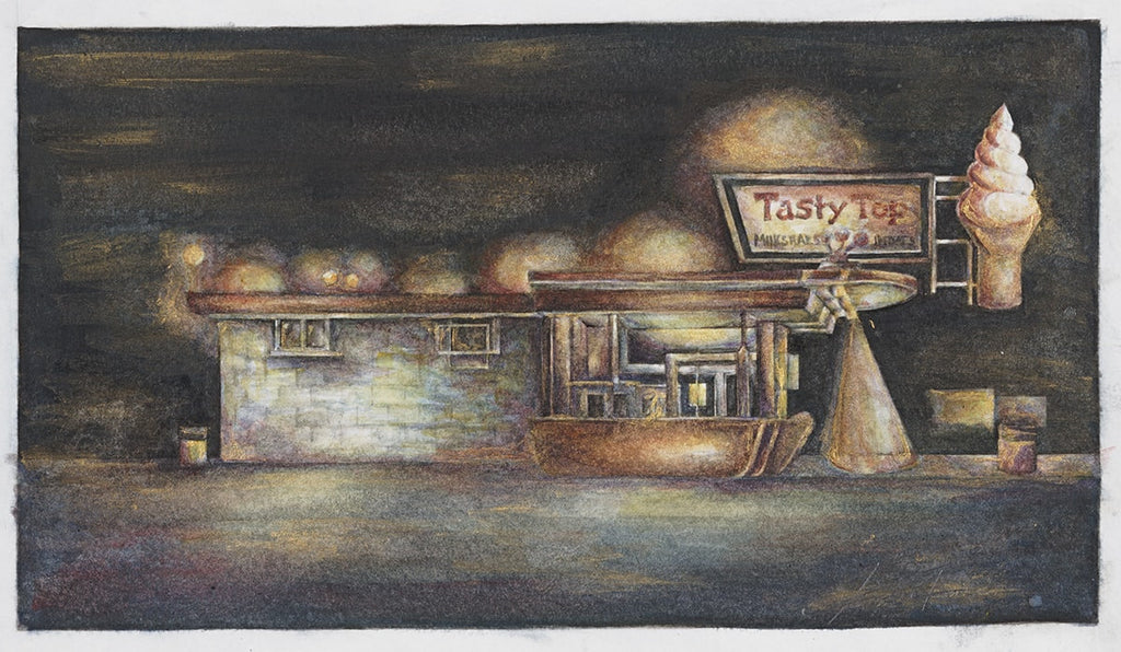 "This is a painting I did of an ice cream stand in my hometown. It was owned by my neighbor. When I was young, his dog used to wander off and I would find her and bring her home. Then he would take me to the stand in the back of his pick-up truck, and let me in the back to make my own ice cream cone. When Hurricane Irene struck, the giant wooden cone adjacent to the stand's sign was destroyed. My neighbor hired me to rebuild and repaint it, before hanging it back up to attract customers."