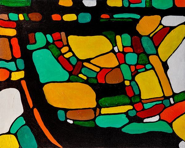"'The Harvest' is a piece that highlights my work with color. It’s a simple painting that uses colors in such a way that it appears to be an aerial view of a farm during harvest season. The colors are additionally accentuated with the black outline. My wife loved this so much she had throw pillows made from the artwork."