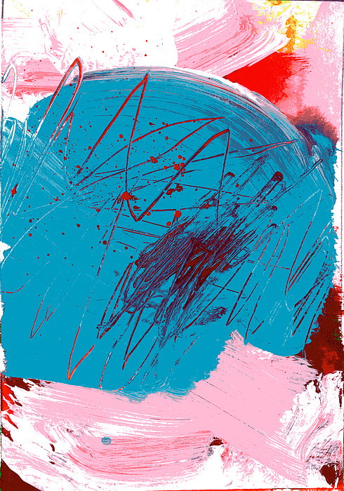 "In 'The Planetary Groove,' artist Grace Goad offers a departure from her more typical palette, introducing a seductive combination of bright turquoise and lush pinks and hints of red. The artist exercised lots of movement in the creation, and in the final painting, as evidenced with the motion in the piece with brushstrokes, splatters and scratches."