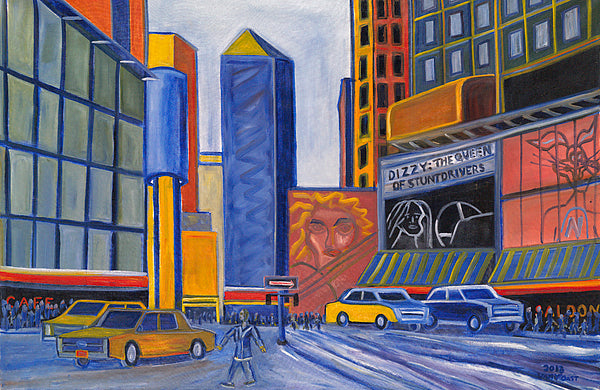 "I’ve always had a passion for painting city-scapes and the activity on the streets. Times Square was the quintessential city-scape try to capture. 'I felt like I could really sink my teeth into the subject matter'. Tried to capture not only the buildings, cars and people; but also the New York Times Square energy."