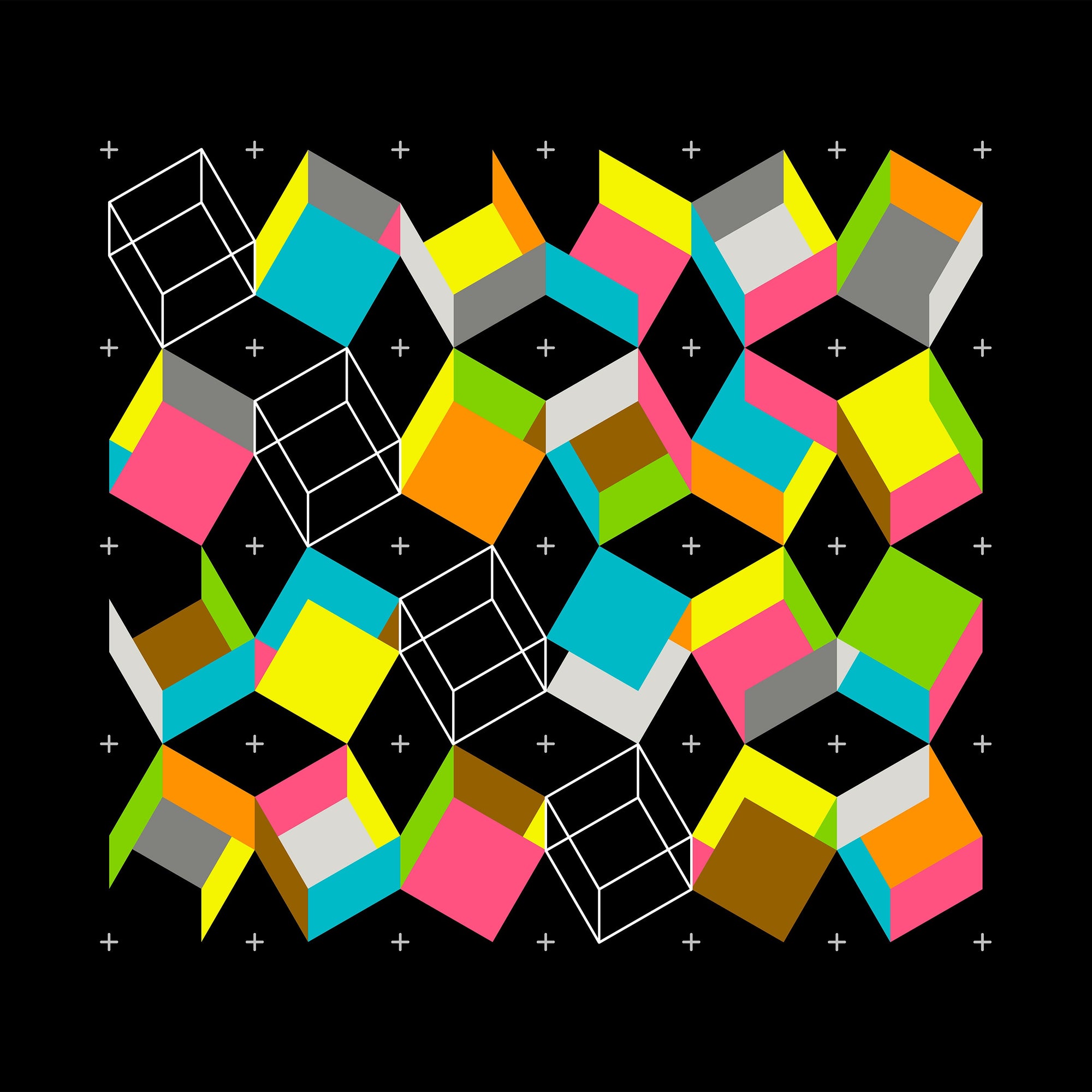 "An outgrowth from my architecture, in some of my works I use the grid as the paradigm to organize a composition. On a black field, tick marks, often used in architectural technical drawings to delineate grids, indicate a grid of 6 columns and 4 rows for a total of 24 grid sections. Inscribed in each section are boxes drawn in isometric to represent them as three-dimensional objects. The boxes alternate, rotated at 30 degrees and 60 degrees. The spaces outside the boxes in each grid section form right triangles. When four grid sections meet the four right triangles form rhombuses (diamonds). As the boxes alternate, so do the rhombuses from vertical to horizontal. Planes of the boxes are rendered with a color palette of yellow, orange, fuchsia, lime, aqua, brown and gray, but each box has some of its planes left out. Beginning at the top left corner, four boxes delineated with line and void of color cross the picture plane at a diagonal. Each box has a dialog with its neighboring boxes, a kind of dance. This is an example of how I use geometric abstraction, using color and geometry to express motion and energy."