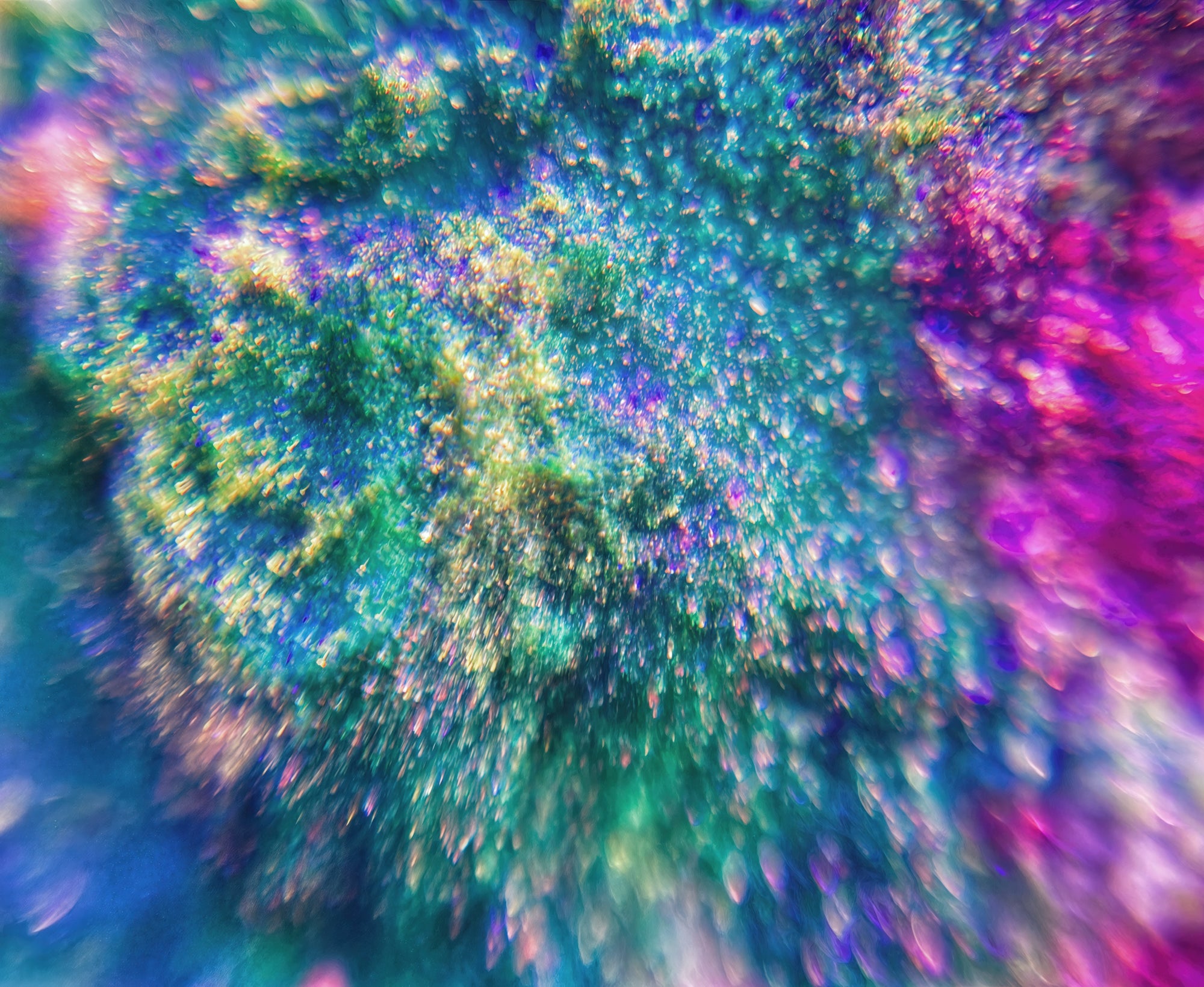 "Still using the same techniques and series of shoots, trying to create 'paintings' using resins, minerals, chemical reactions—most were very short lived, just quick moments before entropy took away the detail and color as the reactions slowed. Using a different palette. This was much more intended to be like a painting than others. Spring pastel colors of resin,I dabbed and layered colors, trying to get to an expressionist type image. The refracted light I was using really complemented the pointillistic dots that make up the image and gave it some kinetic energy, some life."