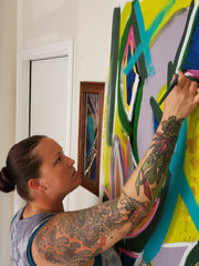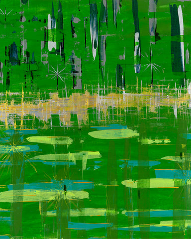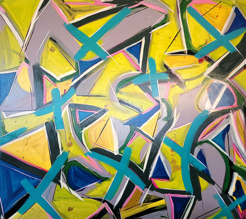 "I started this piece after watching a movie on Jackson Pollock, Then it flowed into lots of shapes and lines and different layers. I would stare at it for days and then add a little more. I love how the different colors come together in an unexpected way."